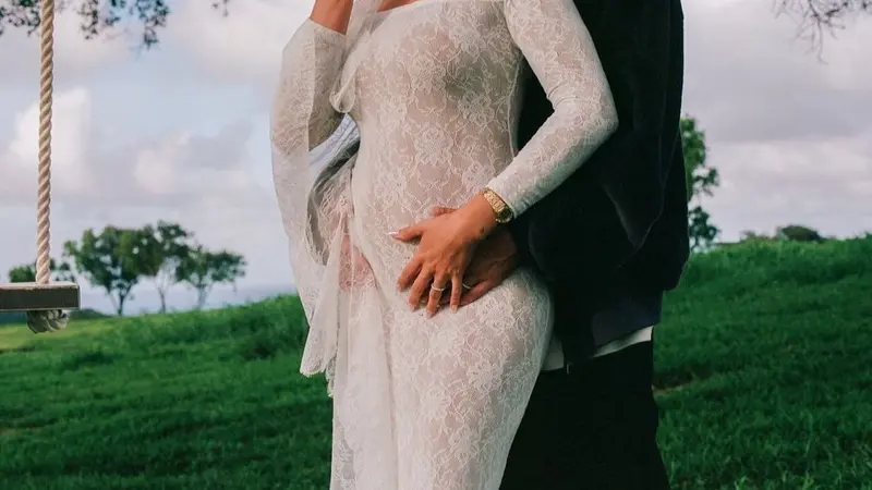 Hailey Bieber mengenakan pakaian serba putih berenda dan kain yang menutup kepalanya dengan anggun. Sementara itu, Justin mengenakan pakaian serba hitam, dengan kaos dalam putih yang tertutup lengkap dengan topi sebagai ciri khas penyanyi Pop terkenal itu. Tampak kebahagiaan dari keduanya menanti anak pertama di usia pernikahan mereka yang sudah cukup lama. Pada akhir postingan Justin Bieber tampak memeluk Hailey Bieber dengan penuh kasih sayang.